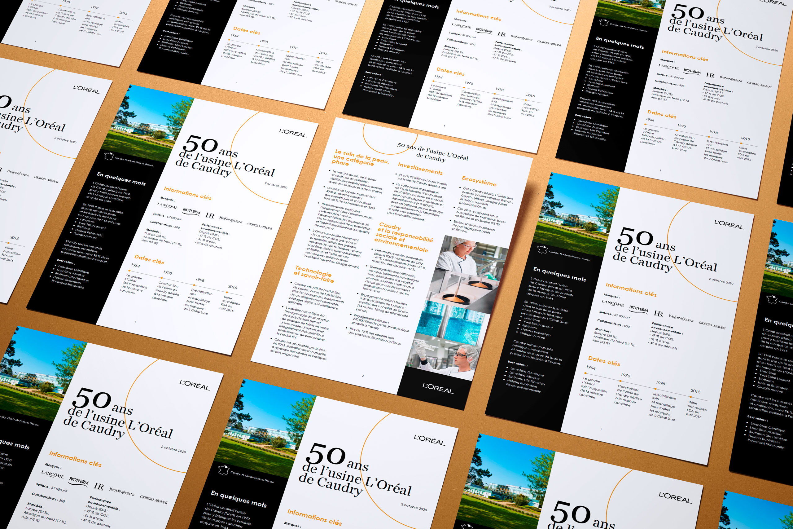 À l'occasion des 50 ans de l'usine L'Oréal de Caudry, j'ai conçu une fiche de présentation pour cet établissement. Ce site, qui regroupe les marques de L'Oréal Luxe, se spécialise dans la production de soins et de fonds de teint. La fiche est prévue pour un tirage recto-verso, adaptée tant au format imprimé qu'au digital.