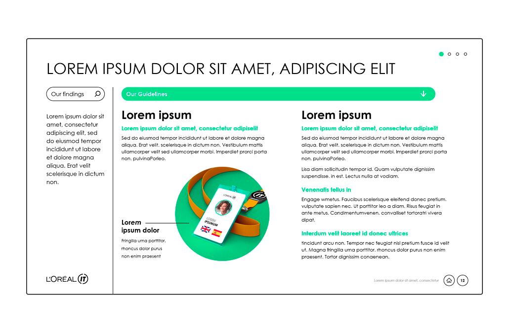 Approche colorimétrique L’ensemble a été conçu avec les couleurs toniques de la palette L’Oréal. Cela a permis de créer un design engageant et innovant, respectant les lignes directrices de L’Oréal IT.